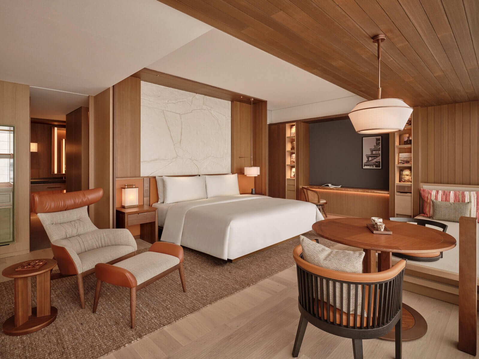 Comprising 221 rooms and suites, the hotel’s architecture draws explicitly on the legacy of Japan’s master craftsmanship, through material discipline: warm wood dominates circulation areas and guest rooms. Hand-finished plaster introduces subtle surface variation. Washi paper diffuses light, eliminating any possibility of harsh glare, while tone is used structurally and texturally to provide a magisterial softness that is uniquely Japanese.